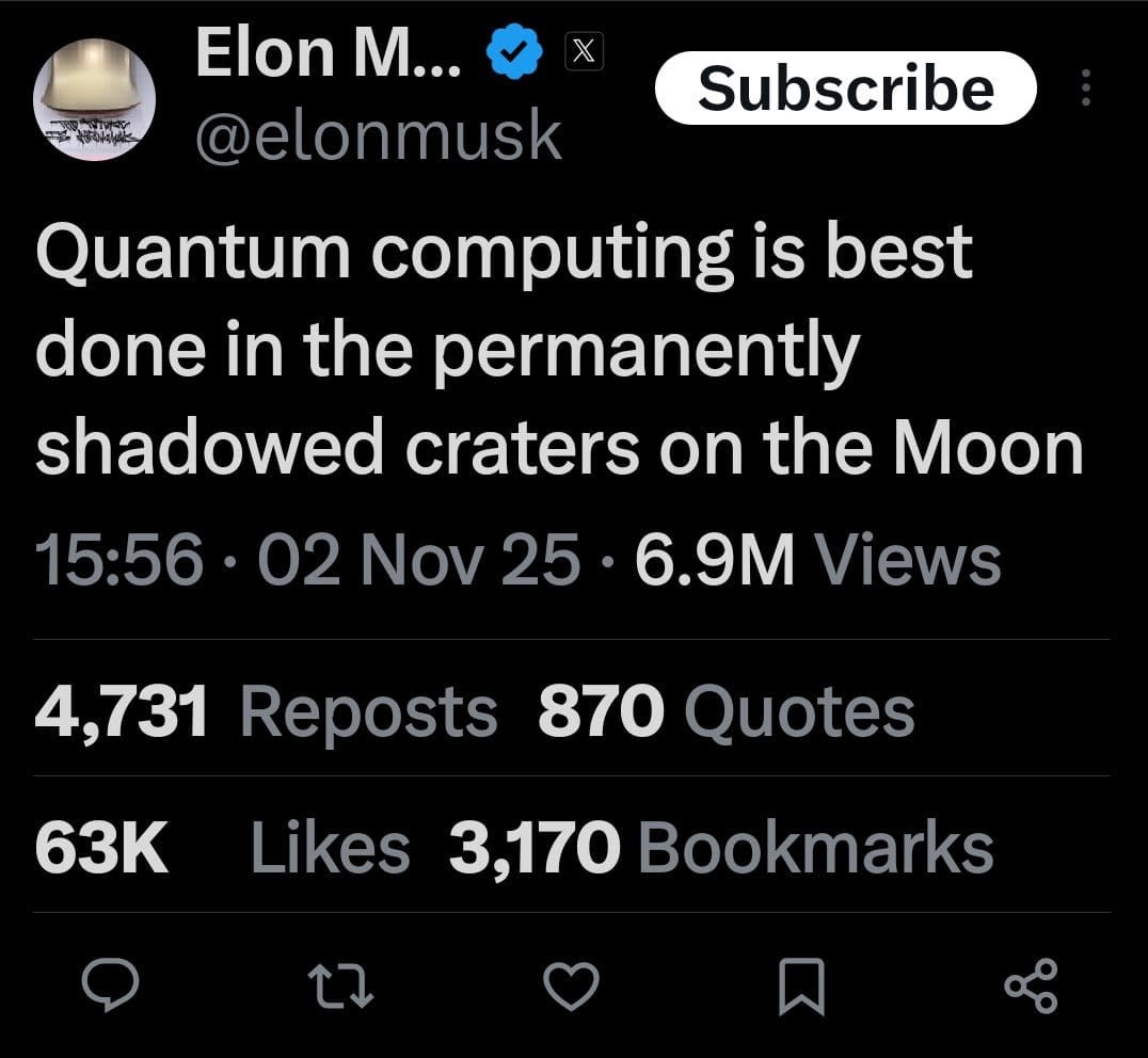 Perhaps Musk’s most ambitious quantum computing proposal emerged in November 2025 when he posted: “Quantum computing is best done in the permanently shadowed craters on the Moon.” This wasn’t merely speculative musing but a carefully considered proposition based on physical advantages these locations offer.
